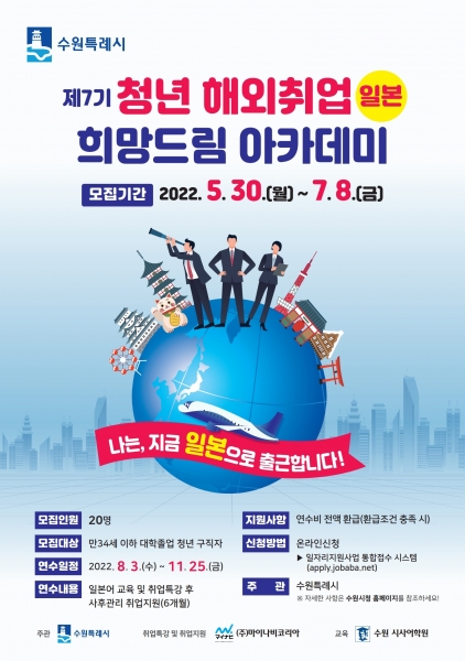 [경기경제신문] 수원시가 미취업 청년에게 일본에서 일할 기회를 제공하는 ‘청년 해외취업 희망드림 아카데미’ 제7기 연수생을 5월 30일부터 7월 8일까지 모집한다.