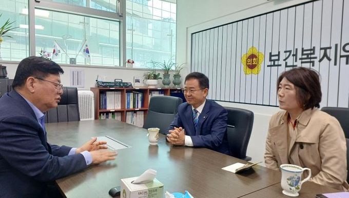 [경기경제신문] 경기도의회 보건복지위원회 이선구 위원장(더불어민주당, 부천2)은 4월 17일 위원장실에서 이용빈 경기복지재단 대표이사와 임숙자 기획조정실장의 예방을 받고, 보건복지 분야 정책역량 강화를 위한 정담회를 가졌다.