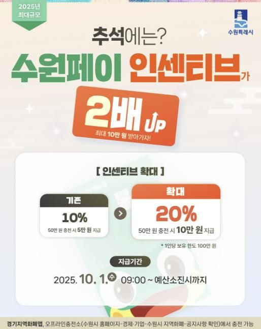 [경기경제신문] 수원시가 추석 명절을 맞아 10월 수원페이 인센티브를 20%로 확대한다.