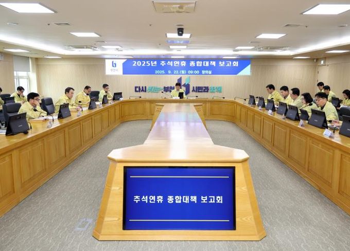 [경기경제신문] 부천시는 지난 22일 시청 창의실에서 조용익 시장을 주재로 부시장을 비롯한 국장과 부서장이 참석한 가운데 ‘2025년 추석 연휴 종합대책 보고회’를 열었다. 이번 보고회는 7일간 이어지는 추석 연휴를 앞두고 시민 생활 전반에 걸친 분야별 대책을 점검하기 위해 마련됐다.