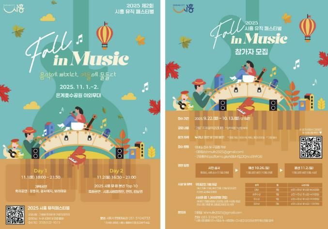 [경기경제신문] 시흥시는 오는 11월 1일부터 2일까지 시흥 은계호수공원에서 ‘2025년 제2회 시흥뮤직페스티벌’ 개최를 앞두고 참가팀을 모집한다. 올해 페스티벌 주제는 ‘시흥 Fall in Music -음악에 빠지다, 가을에 물들다- ’로 ‘가을’을 주제로 한 다양한 장르의 전국 단위 음악경연대회 및 축하공연으로 꾸며진다.