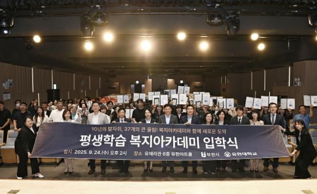 [경기경제신문] 부천시는 지난 24일 유한대학교에서 ‘부천시·유한대학교 복지아카데미’ 입학식과 업무협약식을 열었다. 이번 행사는 조용익 부천시장과 장은영 유한대학교 총장을 비롯해 37개 동 지역사회보장협의체 위원장 등 150여 명이 참석한 가운데 진행됐다.