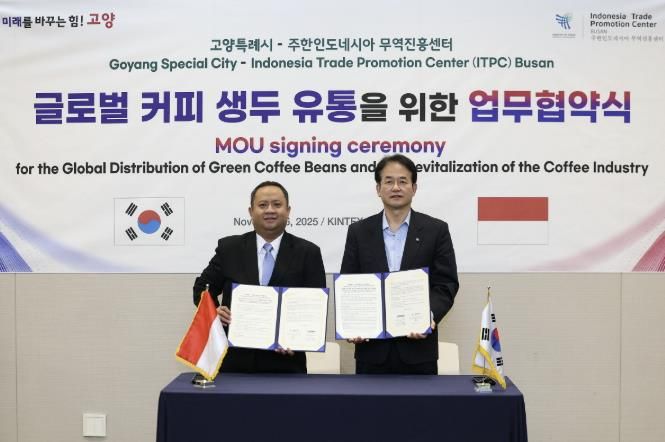 [경기경제신문] 고양특례시는 지난 6일, ‘2025 카페·베이커리페어 시즌2’가 열리고 있는 킨텍스에서 주한인도네시아 무역진흥센터(ITPC 부산)와 ‘글로벌 커피 생두 유통 협력 협약’을 체결했다.