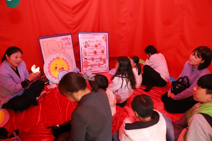 '체험형 성교육 프로그램' 은 ▲생명의 탄생 (뱃속궁궐) ▲임신과 출산 (임신체험복) ▲신생아 돌보기 체험과 ▲생명 나무에 카드 매달기, 카드색칠하기 ▲즉석 카메라 가족 사진찍기 체험 등 다채로운 프로그램으로 구성됐다.