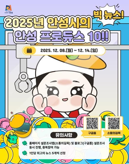 시 관계자는 “2025년 안성이 이뤄낸 의미 있는 변화들은 시민 여러분의 관심과 성원이 있었기에 가능했다”며 “한 해를 마무리하는 시점에 시민분들이 생각하는 ‘올해 안성의 대표 뉴스’ 선정에 많은 참여를 부탁드린다”고 밝혔다.