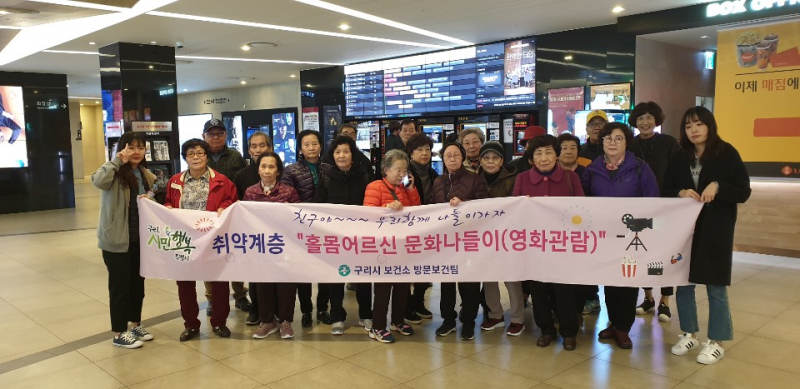【경기경제신문】구리시(시장 안승남)는 지난 14일(수) 구리시 롯데시네마에서 취약 계층 독거노인 20명을 초청하여 독거노인을 위한 첫 번째 문화 나들이 행사로 영화 관람 행사를 진행했다.