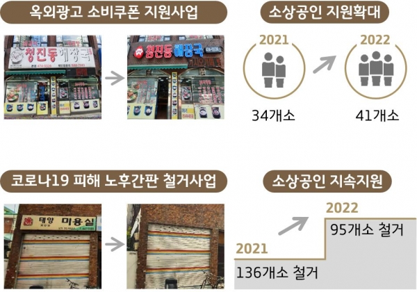 또 노후간판 철거사업은 코로나19 거리두기 여파로 문 닫는 영세업소의 옥외 간판을 건물주 동의를 받아 대신 철거해주는 사업이다.