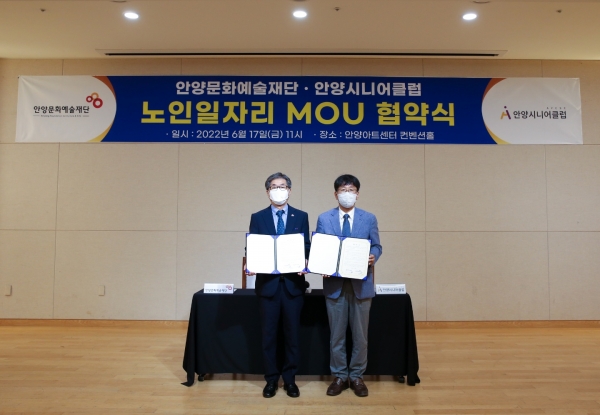 [경기경제신문] 안양시는 지난 17일 안양문화예술재단과 안양시니어클럽이 지역사회 복지 발전과 노인의 삶의 질 향상에 서로 협력할 것을 다짐하는 업무협약(MOU)을 체결했다고 20일 밝혔다.