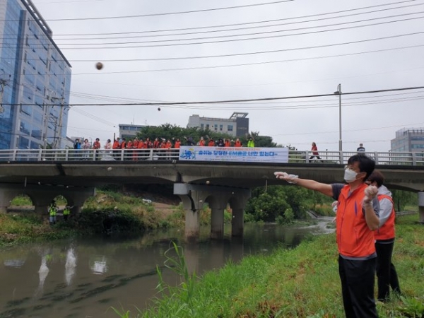 [경기경제신문] 군포시 금정동 경기행복마을관리소는 지난 23일 당정천 금호교 일대에서 EM흙공을 살포하는 행사를 가졌다.