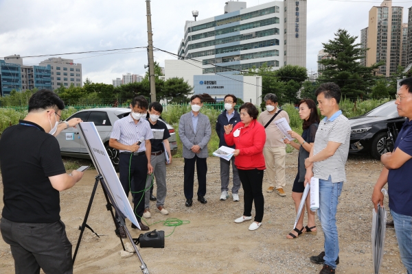 비가 내리는 가운데 진행된 복합문화센터 건립공사 현장점검에서는 함께 진행되고 있는 청년 전용 활동공간과의 연계성 확대, 시설의 효과적인 운영방안 마련, 진입로 확장 등에 대한 의견을 제시했다.