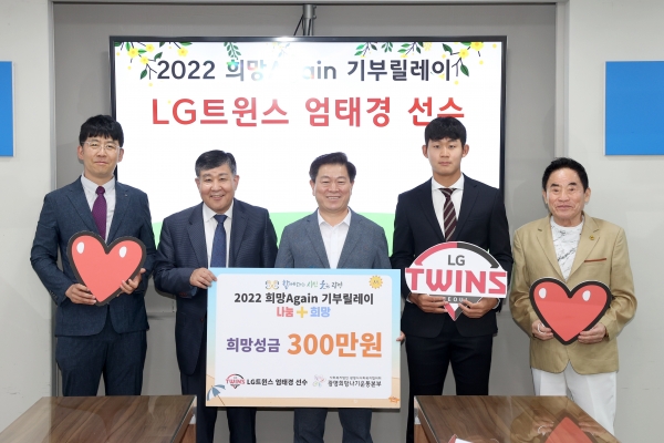 엄태경 선수는 광명리틀야구단에서 야구선수의 꿈을 키워오면서 프로구단에 입단했으며 이날 광명시민의 일원으로 “2022 희망Again 기부릴레이”에 참여했다.