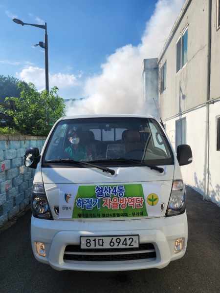 이 같은 피해를 방지하고자 철산4동 자율방역단은 지난 6월 21일 발대식을 가진 데 이어 7월 2일에는 하수관이 많아 해충번식에 취약한 단독필지 구역을 중점적으로 연무기를 활용한 집중 방역 활동을 진행했다.