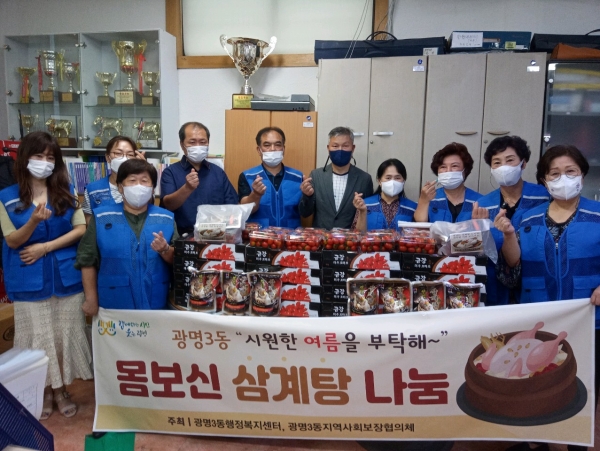 안승필 광명3동장은 “지역주민들을 위해 애써주신 광명3동 지역사회보장협의체에 감사드린다”며 “어르신들이 정성껏 준비한 삼계탕과 과일을 드시고 올여름 더 건강하게 지내셨으면 좋겠다”고 전했다.