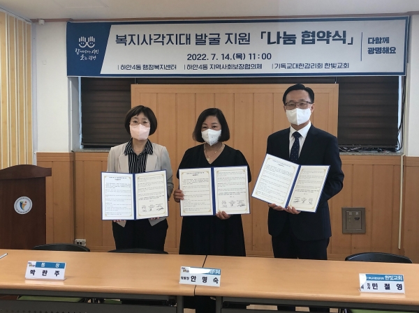 한빛교회는 이번 협약으로 주민공유 한끼나눔상자 사업에 매달 물품을 지원하며 복지사각지대 위기가정 발굴시 지역사회 보호 체계 구축에 뜻을 같이하기로 했다.