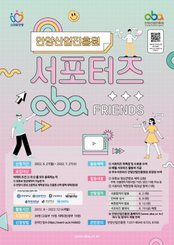 또한 ‘안양산업진흥원 서포터즈 : aba프렌즈’의 모집기간은 6월 27일부터 7월 27일 진행되며 온라인으로 접수를 받는다.