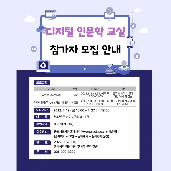‘디지털 인문학 교실’은 8월4일부터 8월30일까지 온라인 화상회의 플랫폼 줌을 활용해 비대면으로 진행되고 청소년 및 직장인도 참여할 수 있도록 야간에도 운영한다.