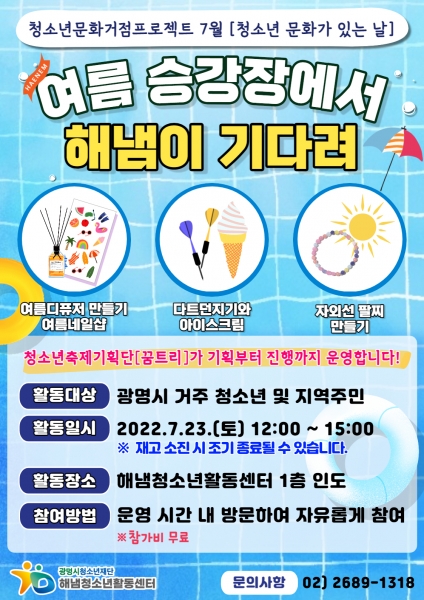 광명시 청소년 및 지역 주민이라면 누구나 참여 가능하며 여름디퓨저만들기 및 여름네일샵 다트던지기와 이이스크림 자외선팔찌만들기 등 총 3가지 체험 부스를 운영한다.