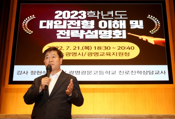 이번 설명회는 광명시 진로진학 교사협의회 정현석 교사가 강사로 나서 2023학년도 수능체제 이해와 대입전형 분석을 설명하고 수시·정시모집 전형별 특징 및 지원 전략 등을 소개하며 빠르게 변화하는 입시환경 속에서 정확한 입시 정보를 제공하는 자리가 됐다.