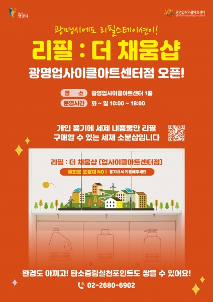 광명업사이클아트센터는 지난 5월 일회용 플라스틱 쓰레기를 줄이기 위해 친환경 세제 리필 스테이션인 ‘리필 : 더 채움샵’을 열었다.