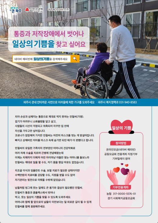 한편 테마모금 ‘나눔으로 싹이트는, 드림씨앗’ 사업은 안타까운 사연으로 어려움에 처한 위기가구를 지원하기 위한 파주시 자체 모금사업으로 1기부터 6기까지 6가구에 치료비·생계비 등으로 약 7,500만원의 모금액을 지원하고 있다.