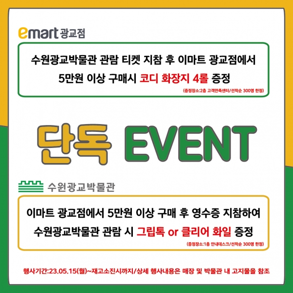 각 선착순 300명 한정으로 진행하며 이마트 광교점 2층 고객 만족센터와 수원광교박물관 1층 안내데스크에서 사은품을 받을 수 있다.