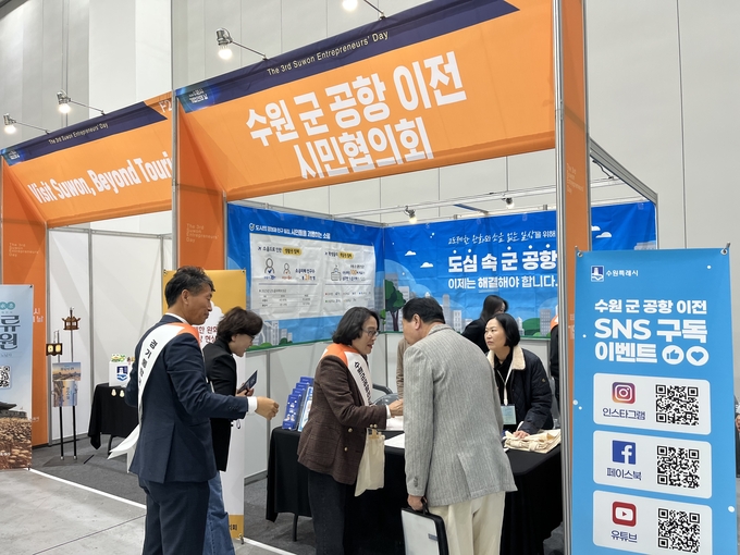 홍보부스는 ▲수원 군 공항 이전 10만 서명 캠페인 ▲SNS 팔로우 이벤트 ▲소음 및 고도제한 피해 현황 현수막 홍보 등으로 구성된다.