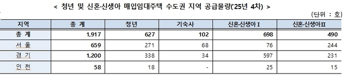 이달 18일에는 청년과 신혼·신생아 가구를 대상으로 하는 매입임대주택 통합 공고(‘25년 제4차)가 시행된다. 전국 3,133호 중 수도권 지역에 약 60% 이상인 1,917호가 공급되며, 서울 지역의 경우 25개 자치구 중 22개 자치구에서 공급이 이뤄진다.