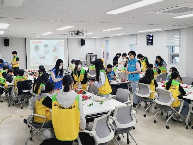 [경기경제신문] 시흥시 배곧2동 청소년지도협의회와 ‘제2기 배곧2동 청소년봉사단’이 함께한 카네이션 만들기 및 환경정화 활동이 지난 20일에 진행됐다.