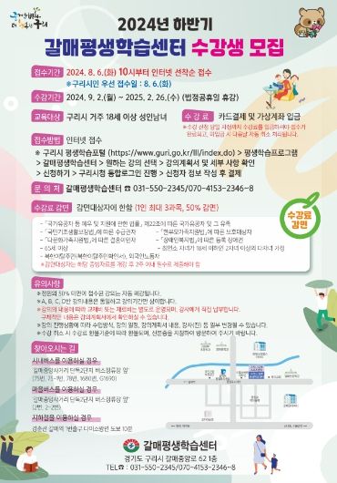 [경기경제신문] 구리시는 접수는 8월 6일부터 2024년 하반기 갈매평생학습센터 과정 수강생을 선착순으로 모집한다.