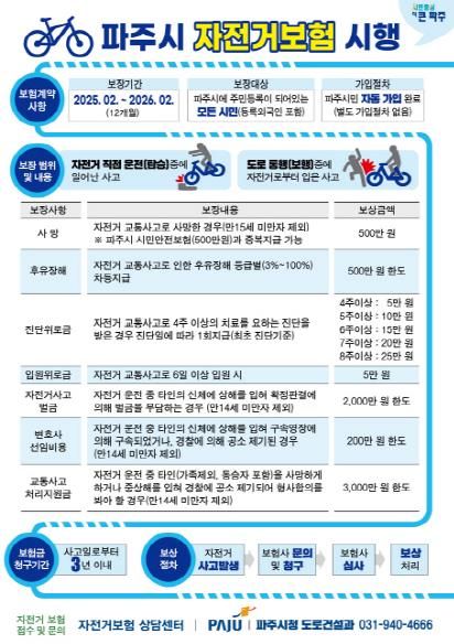파주시에 주민등록을 둔 시민이라면 별도의 절차 없이 자동으로 자전거 보험에 가입되며, 자전거와 관련된 사고 발생 시, 보험 보장 내용에 따라 보험사로부터 보상을 받을 수 있다.