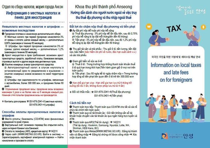 이에 따라 외국인 맞춤형 납세 홍보 수단으로 기존의 영어·중국어·베트남어 3개국 언어로 제작한 체납 안내 리플렛에 러시아어를 추가하여 4개국 언어로 새롭게 제작했고, 포스터, 안내 전단지 등과 함께 외국인 관련 시설 및 단체와 읍·면·동사무소에 비치한다. 외국인이 많이 거주하는 지역에 대한 집중 홍보를 통해 납부 방법과 체납에 따른 불이익을 안내하여 자진납부할 수 있도록 유도할 계획이다.