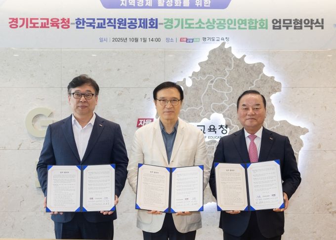 [경기경제신문] 경기도교육청이 1일 남부청사에서 경기도소상공인연합회, 한국교직원공제회와 ‘지역경제 활성화를 위한 상생 업무협약’을 체결했다.