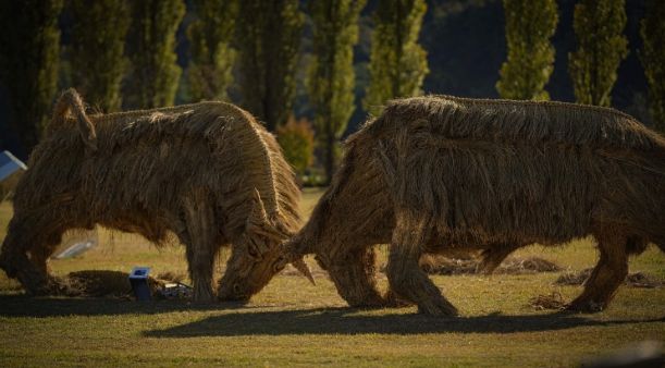 [경기경제신문] 아름다운강천 사회적협동조합은 경기문화재단의 지원을 받아 ‘지붕 없는 박물관’ 사업의 일환으로 2025년 강천섬에 짚으로 만든 황소 조형물 두 건을 설치했다. 이번 작품은 소싸움을 연상시키는 역동적인 구도로 제작되어, 자연 속에서 생동감 넘치는 예술적 장면을 연출했다.