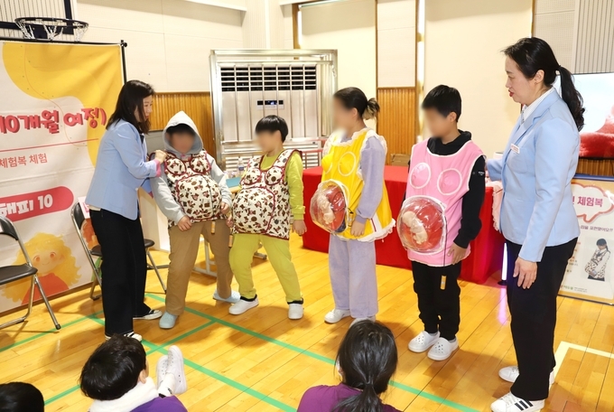 '체험형 성교육 프로그램' 은 ▲생명의 탄생 (뱃속궁궐) ▲임신과 출산 (임신체험복) ▲ AI 신생아 돌보기 체험과 ▲생명 나무에 인간 존중 카드 달기 ▲ 즉석 사진찍기 체험 등 다채로운 프로그램으로 구성됐다.