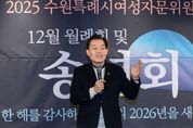 [경기경제신문] 이재준 수원시장이 3일 인계동 한 음식점에서 열린 수원시 여성자문위원회 송년 행사에 참석해 “아빠들을 위한 프로그램 운영부터 여성 권익 증진을 위한 후원까지 올해 여성자문위원회가 보내주신 따뜻한 성원에 감사드린다”고 말했다. 이어 “내년에도 수원시를 대표하는 여성단체로서, 여성들과 이웃들의 삶 구석구석을 살펴 주시길 바란다”고 덧붙였다. 이날 행사에는 수원시 여성자문위원회 김외순 회장과 회원 등 50여 명이 참석했다. 여성복지 발전에 이바지한 유공자에게 수원시장상, 수원시의회 의장상, 경기도지사상, 국회의원상 등을 수여했다.