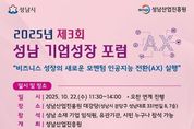 [경기경제신문] 성남산업진흥원은 오는 10월 22일 11시 30분부터 ‘인공지능 전환 실행 전략’을 주제로 2025년 제3회 ‘성남기업성장포럼’을 개최한다. 이번 포럼은 성남시 중소기업의 성공적인 ‘인공지능 전환(AI Transformation)’을 실질적으로 지원하기 위해 마련됐다. ‘성남기업성장포럼’은 매회 성남시 중소기업이 직면한 경영환경 변화 이슈를 주제로 선정하여 개최되고 있다. 올해는 제1회 ‘기후테그 비즈니스 새로운 성공전략’, 제2회 ‘세계교질서 변화와 맞춤형 경영전략’ 등 두 차례 개최됐고, 14개 유관기관과 300여명의 기업인이 참여했다. 포럼 참가는 성남시 소재 기업인이면 누구나 가능하고, 성남산업진흥원 홈페이지를 통해 참가 신청을 할 수 있으며 행사 당일 현장 등록도 가능하다. 포럼에서는 한국산업기술진흥원 곽용원 첨단산업공급망단 단장이 정부의 ‘인공지능 전환’ 지원정책과 지원사업을 소개하고, 최재식 ㈜인이지 대표이사(카이스트 교수, 국가인공지능전략위원)가 ‘인공지능 전환’을 통한 비즈니스 혁신 사례와 구체적인 실행 전략을 제시할 예정이다. 본행사에 앞서 열리는 ‘지원사업 미니설명회’에서는 성남시가 운용하는 6,000억 원 규모의 판교유니