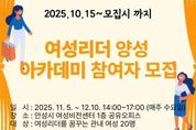 [경기경제신문] 안성시는 지역사회 발전을 이끌 열정있고 능력있는 여성 지도자를 발굴·육성하기 위해 ‘2025년 안성시 여성리더 양성 아카데미’ 기본과정 교육 참가자를 모집한다. 이번 아카데미는 적극적으로 참여할 수 있는 여성 시민 누구나 신청할 수 있으며, 신청기간은 오는 10월 15일부터 시작된다. 교육은 11월 5일부터 12월 10일까지 6주간 매주 수요일에 안성시여성비전센터 (발화대길 25) 1층 공유오피스에서 진행 될 계획이다. 교육 내용은 ‘나는 당신이 행복했으면 좋겠습니다.’ 라는 주제로 김경희 강사의 행복소통 리더십 강의로 개강식을 열고 2~3주차는 감성을 담아 나를 알리는 SNS 활용법 이론편과 실습편, 4~5주차에는 나만의 비서 만들기 챗봇과 생성형 AI교육 이론편과 실습편을 구성하여 최신 트렌드에 맞춘 리더 역량 강화를 위한 강의들로 구성했으며 6주차에는 퍼실리테이션 기법을 활용하여 지역 내 현안 문제를 파악하고 리더로서 해결 방법을 제시하는 과정을 마지막으로 수료식을 가질 예정이다.