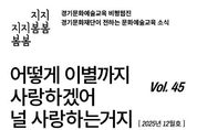 [경기경제신문] 경기도와 경기문화재단이 12월을 맞아 올해를 마무리하는 문화예술교육 비평웹진 〈지지봄봄〉 45호를 발행했다. ‘어떻게 이별까지 사랑하겠어, 널 사랑하는 거지’를 제목으로 한 이번 호는 현장의 지속가능성, 행정 구조의 과제, 비평의 역할 등 문화예술교육이 직면한 주요 쟁점을 깊이 있게 다룬다. 먼저, 기획자 유모라의 글 '예술인으로 존재하고 연대하기 위하여 - 홍우주 예술학교 A.L.T.O. 탄생기'는 11년 차 홍우주사회적협동조합이 ‘홍대앞 정신’을 잇기 위해 시작한 ‘예술학교 A.L.T.O.’의 배경과 의미를 조명한다. 파일럿 프로그램을 통해 확인한 연대의 가능성과 함께, 홍우주가 그리는 지속 가능한 지역 문화예술 생태계를 탐색한다. ‘게릴라노동자들’의 대담 '문화재단 실무자 탈출기 - 『나라를 위해서 일한다는 거짓말』 함께 읽기'에서는 전 문화재단 실무자들이 공직사회의 조직 문화와 업무 환경을 돌아본다. 노한동의 책을 매개로 공공 조직의 현실을 비판적으로 되짚고, 여전히 현장에서 고군분투하는 실무자들에게 연대와 응원의 메시지를 전한다. 광주광역시 청소년삶디자인센터 김소연 기획실장 인터뷰 '이 글은 의심과 기대를 포함하고 있습니다'는 삶디의