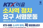 [경기경제신문] 부천시는 서해선 KTX-이음 열차의 소사역 정차를 추진하기 위해 10만 서명운동을 시작했다. 이번 서명운동은 12월 19일까지 진행되며, 관내 시민과 인천·서울 서남권 주민의 광역철도 접근성을 높이고, 지역 산업과 관광 활성화를 통한 경제적 효과를 목표로 추진된다. 온라인 서명운동은 큐알(QR)코드와 부천시 홈페이지를 통해 참여할 수 있다. 오프라인 서명운동은 시청과 원미구·소사구·오정구청, 각 동 행정복지센터 민원실을 비롯해 소사역, 부천시청역 등 주요 전철역과 아파트 단지 등 시민 접근이 쉬운 장소에서 진행된다. 이와 함께 시는 이번 서명운동에 시민과 지역 단체, 학교 등 다양한 주체가 참여할 수 있도록 적극적인 홍보활동도 병행할 계획이다. 특히‘서해선 KTX-이음 소사역 정차’의 필요성과 지역 발전 효과를 널리 알리기 위해 소셜네트워크서비스(SNS), 지역 축제 현장 캠페인 등을 통해 적극적으로 홍보할 예정이다. 조용익 부천시장은 “KTX-이음 소사역 정차는 단순한 교통 개선을 넘어, 서해선 시대에 부천이 수도권 서남부의 중심으로 도약할 수 있는 계기”라며 “시민의 서명 하나하나가 소중한 힘이 되는 만큼 많은 참여를 바란다”고 말했다.