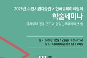 [경기경제신문] 경기도 수원시립미술관은 한국큐레이터협회와 함께 2025년 학술 세미나 '큐레이터 공동 연구와 협업-코퍼레이션 힙'을 주제로 12월 12일 오후 1시 수원시립미술관 행궁 본관에서 개최한다. 이번 세미나는 기관과 기획자 간 연구의 지평을 확장하는 담론의 장을 위해 수원시립미술관과 한국큐레이터협회가 업무협약을 체결하고 공동 연구와 협업 사례를 조명한다. 세미나는 “큐레이터 공동 연구와 협업-코퍼레이션 힙”을 주제로 김현숙 KISO미술연구소 소장이 한일 공동 연구 전시 사례로서 《한일 근대미술가들의 눈》의 연구 과정을 발표하며 세미나의 첫 문을 연다. 전북도립미술관 이애선 관장은 “빈손의 연대, 가득한 변화 – 연대는 선택이 아닌 책임”이라는 주제로 전라북도 소재 예술기관들의 협업과 연대 사례를 살펴보며, 이영준 김해문화관광재단 정책홍보팀장은 공동 연구와 협업 전시가 어우러진 사례로서 “문예회관 전시실, 협업과 연대로 풀어보는 대안들”을 발표한다. 2부에서는 한국화학연구원 고영주 전문경영위원이 “대전 과학예술 융합 사례”에 관한 연구를 공유하고, 박지영 독립큐레이터는 경남도립미술관에서 기획한 《실로 어마어마한 일이다》전시의 기획 과정에서 동반된 협업
