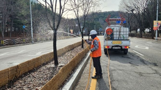 [경기경제신문] 수원시가 가로수에 염분중화제를 살포해 미세먼지와 염분을 씻어내고, 가로수의 생육환경을 개선한다.