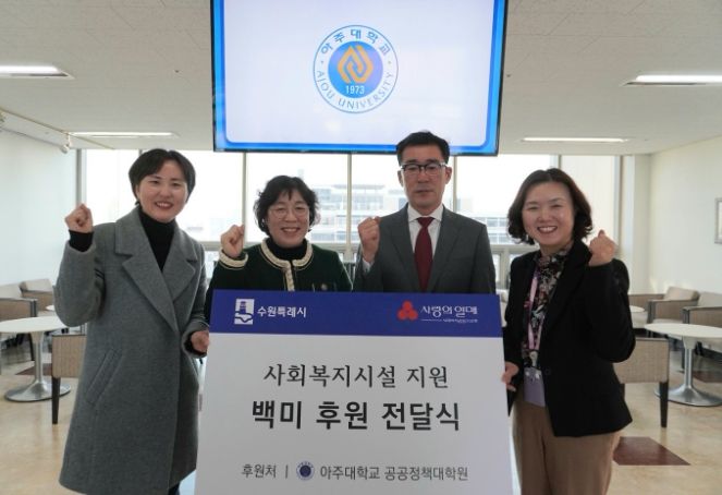 14일 아주대학교 공공정책대학원(영통구 원천동)에서 열린 전달식에는 권혁성 공공정책대학원장, 박란자 수원시 복지여성국장, 수원시사회복지협의회 이미연 사무국장 등이 참석했다.