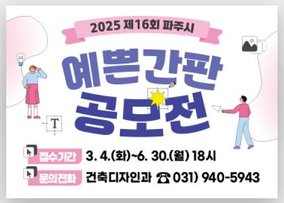 ‘예쁜간판 공모전’은 쾌적한 생활 환경과 아름다운 도시경관 조성을 목표로 도시경관 향상에 기여할 수 있는 예쁜간판 디자인을 발굴하기 위해 16회째 실시하고 있는 것으로, 경기도 내에서는 파주시가 유일하며, 전국에서 가장 오래된 공모전이다.