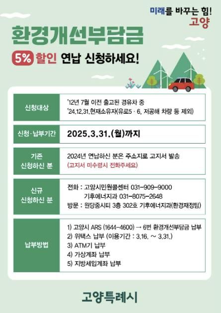 [경기경제신문] 고양특례시는 환경개선부담금 납부 대상자의 부담을 덜어주고 자진 납부를 유도하기 위해 2025년 3월에도 환경개선부담금 연납 제도를 시행한다고 밝혔다.