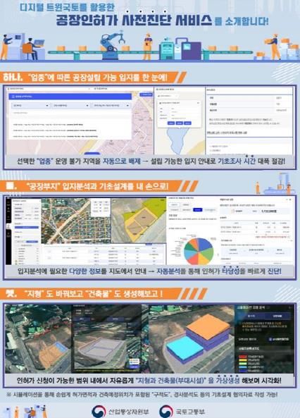 ‘공장인허가 사전진단 서비스’는 복잡한 공장설립절차로 소요되는 기업인들의 시간과 비용을 줄일 수 있도록 희망하는 지역의 공장 인허가 가능 여부를 검토해 볼 수 있는 서비스다.