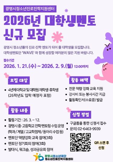 [경기경제신문] 광명시청소년재단 청소년진로진학지원센터는 관내 중·고등학교 청소년 대상 학과 멘토링 운영을 위해 ‘2026년 대학생 멘토단(wave)’을 모집한다고 밝혔다.