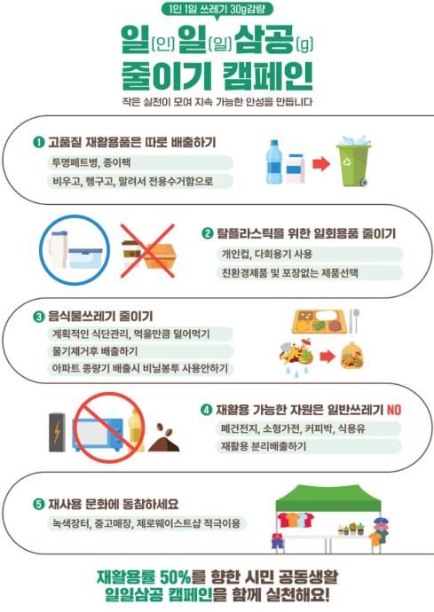 시는 생활 속에서 실천할 수 있는 과제로 △고품질 재활용품 분리배출 △일회용품 및 음식물쓰레기 감량 △재활용 자원의 올바른 배출 △재사용·재활용 문화 동참 등을 제시했다.
