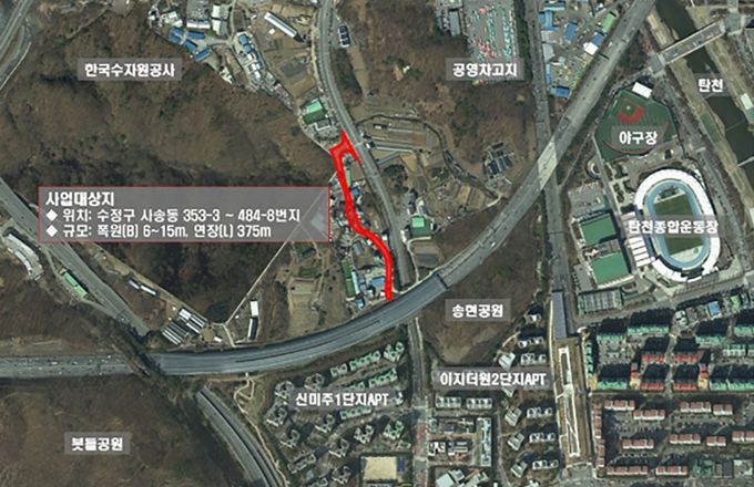 [경기경제신문] 성남시 수정구 사송동 353-3번지~484-8번지 일원에 오는 2030년까지 375m 길이의 도로 개설 사업이 추진된다.