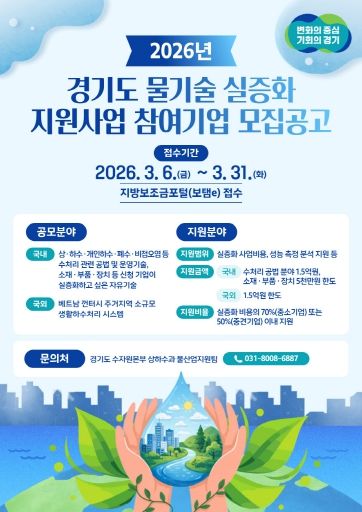 [경기경제신문] 경기도가 ‘2026년 경기도 물기술 실증화 지원사업’ 참여 기업을 공개 모집한다.