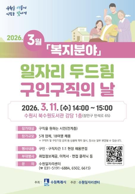 [경기경제신문] 수원특례시는 3월 11일 오후 2시부터 3시까지 북수원도서관 강당에서 ‘3월 일자리 두드림 구인·구직의 날’을 개최한다.